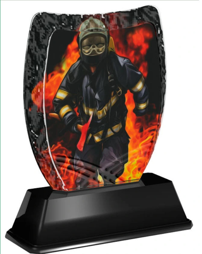 Barevná akrylátová trofej s hasičem v ohni ACE2018M48