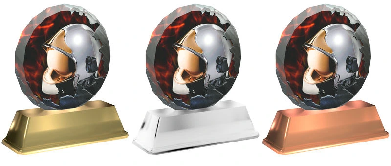 Tato akrylátová trofej je vysoká 13 cm a má na výběr ze třech různě barevných podstavců - zlato, stříbro, bronz. Lze přidat štítek s vlastním textem.