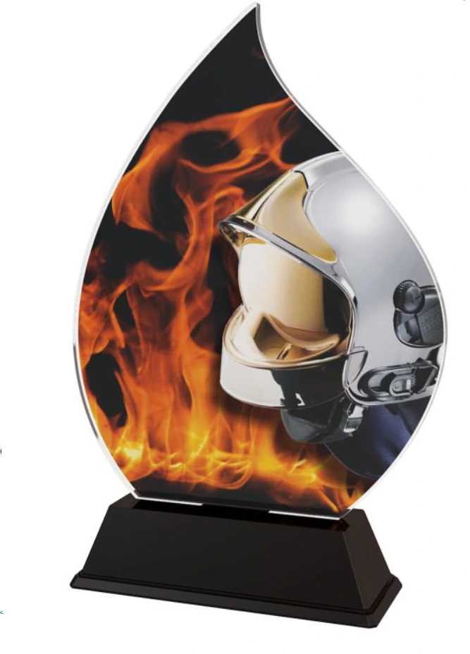 Barevná akrylátová trofej s hasičskou helmou a ohněm ACFIREM1