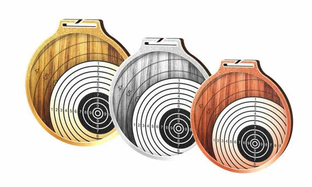 Dřevěná medaile s motivem střelby   Zlato - 9 cm   Stříbro - 8 cm    Bronz - 7 cm