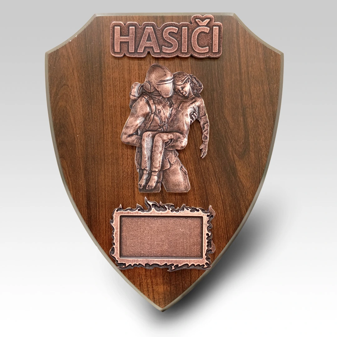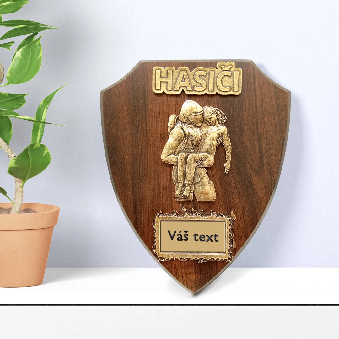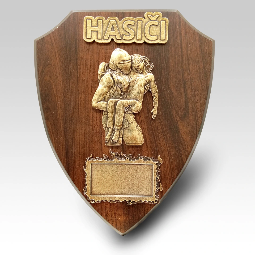 Dárek který udělá radost profesionálnímu i dobrovolnému hasiči. To je dřevěná plaketa tvaru erbu s motivem hasiče zachraňujícího dítě o velikosti 22,5x18cm z naší výroby. Plaketa je absolutní novinka na našem trhu - za jejím vývojem stojí náš profesionální český tým specialistů na trofeje.