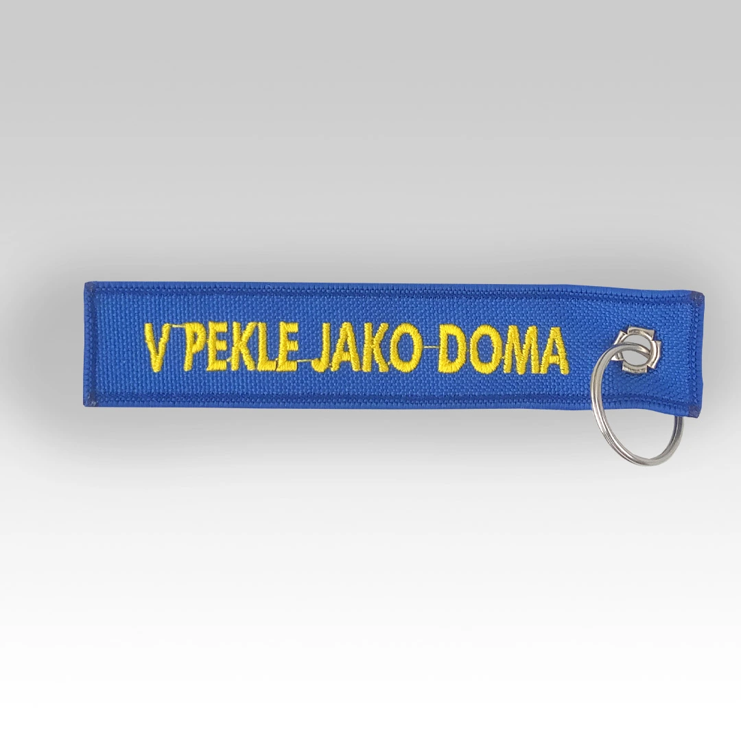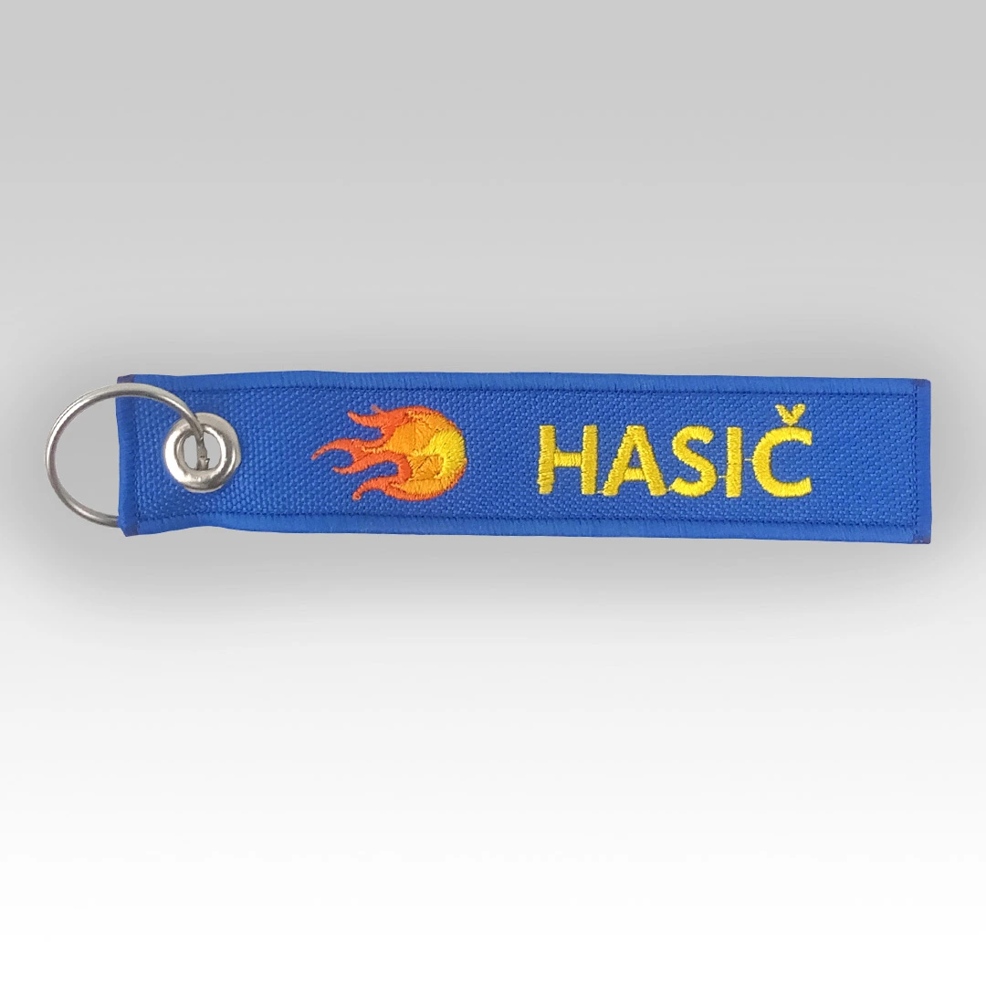 Vyšívaný oboustranný nápis - klíčenka má náš vlastní design s motivem Hasič v pekle jako doma.
