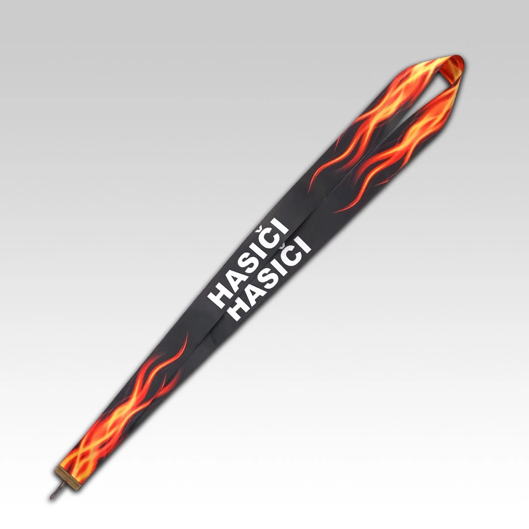 Potisk v motivu ohně - stuha má náš vlastní design pro potisk v barvách a tvaru ohně s nápisem Hasiči