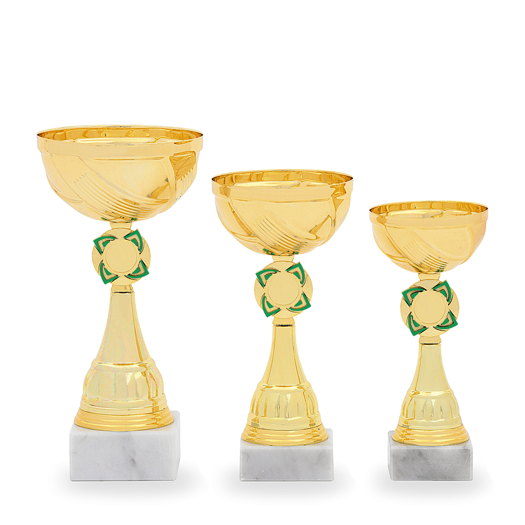 3 různé velikosti    barva: zlatá a zelená    podstavec: bílý    prostor pro emblém    možnost umístění poklice