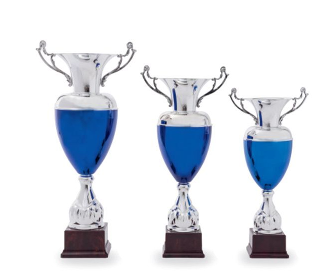 3 různé velikosti    barva: stříbrná a modrá    podstavec: hnědý