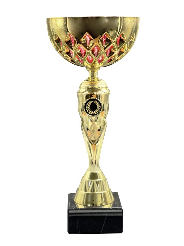Na pohár lze umístit emblém. v ceně poháru není zahrnuta cena štítku  barva: zlatá/červená  podstavec: černý