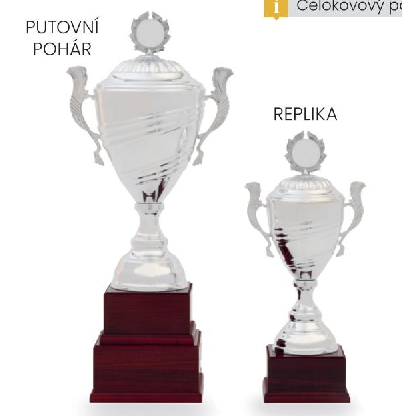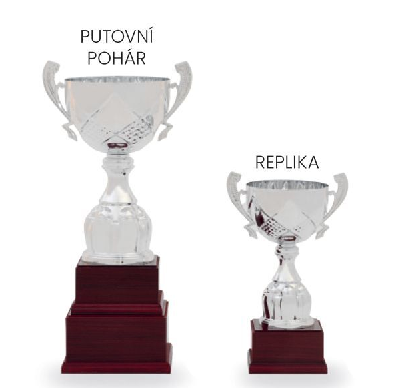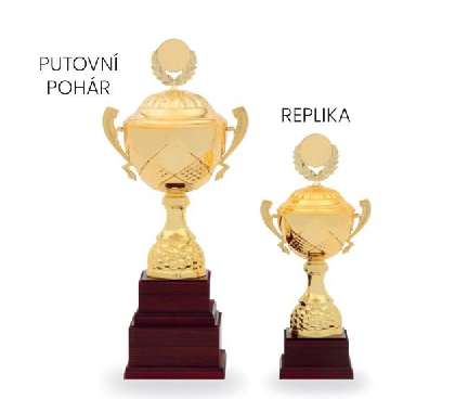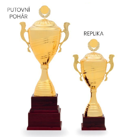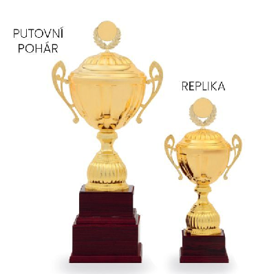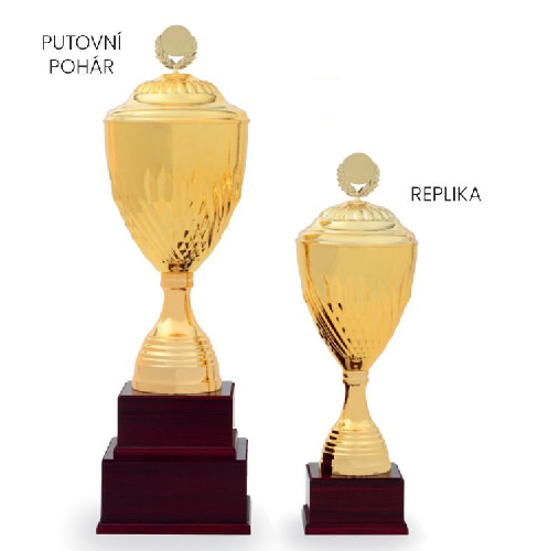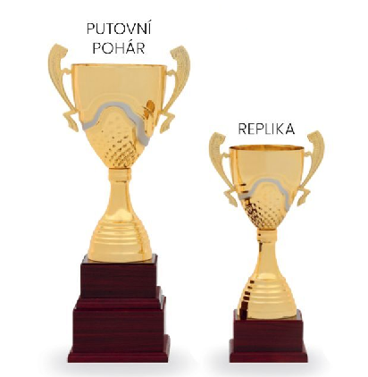 Putovní pohár a replika    barva: zlatá    podstavec: hnědý    možnost umístění emblému