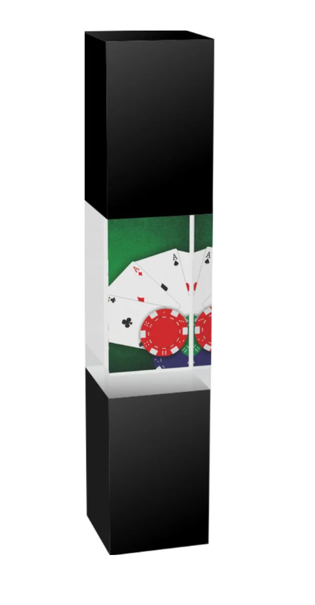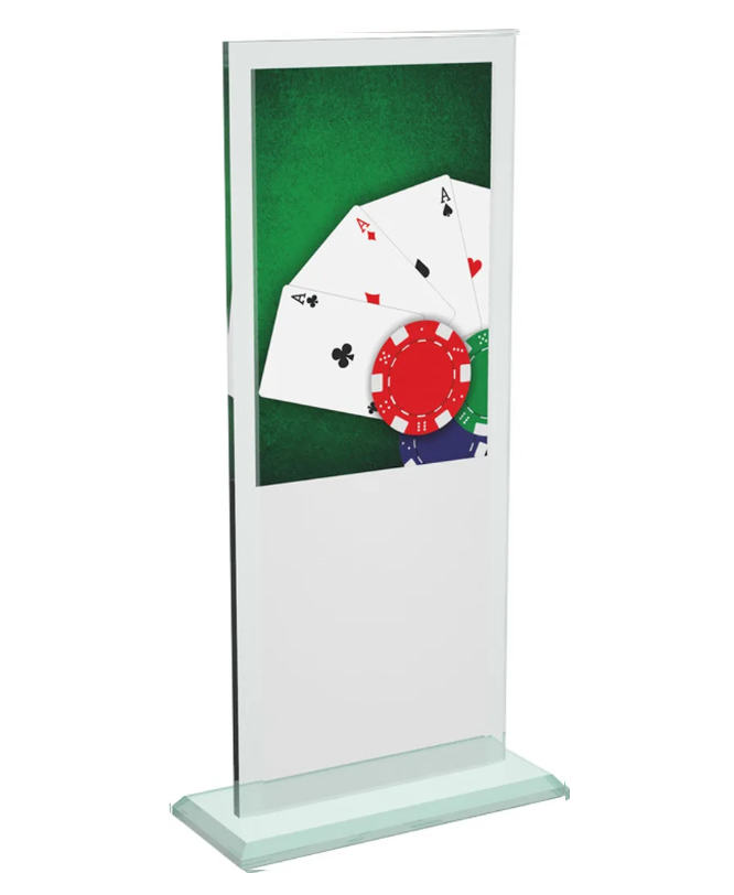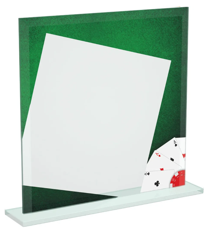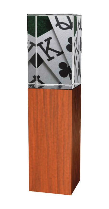 Elegantní skleněná trofej s UV HG tiskem - spojení skla a dřeva  pro jedinečný vzhled. V ceně trofeje je zahrnuto také UV HQ tisk bílou barvou na podstavec.